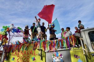El desfile también contó con la presencia de la Reina, Princesa y Dama saliente del Carnaval 2025, además de las candidatas a la corona 2026, quienes desfilaron entre ovaciones y muestras de cariño del público.